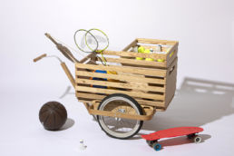 Preuve vivante que la sobriété ne sacrifie pas l’esthétique, la malle nomade a été conçue et fabriquée pour s’intégrer dans la nature sans en être la contradiction. Dans une démarche respectueuse de l’environnement, ce mobilier prend forme en valorisant les rebus et les chutes de bois de l’industrie nautique, de celle du parquet et du placage. Les roues d’un diamètre de 16 pouces sont d’anciennes roues de vélo pour enfant, récupérées pour être réemployées dans un nouveau contexte. En valorisant ces déchets, la malle nomade propose une nouvelle manière de concevoir la création d’objets de design en combinant les exigences écologiques de notre époque avec l’émergence de modes de vie doux et attentifs aux rythmes de la nature.